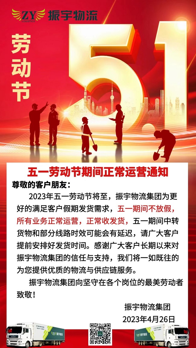2023年五一勞動節(jié)將至,振宇物流集團為更好的滿足客戶假期發(fā)貨需求,五一期間不放假,所有業(yè)務正常運營,正常收發(fā)貨,五一期間中轉貨物和部分線路時效可能會有延遲,請廣大客戶提前安排好發(fā)貨時間。感謝廣大客戶長期以來對振宇物流集團的信任與支持,我們將一如既往的為您提供優(yōu)質的物流與供應鏈服務。