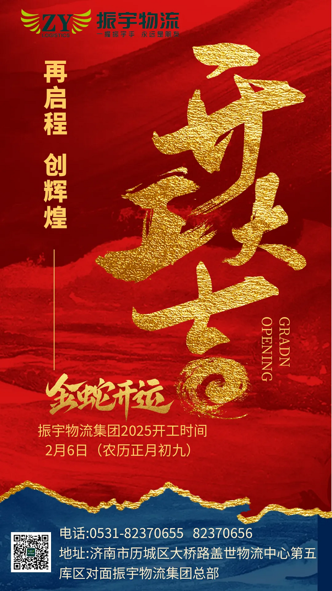 新春開工,瑞氣盈門!告別舊歲的忙碌,振宇物流在2025年的燦爛春光里,再次揚帆起航,于2月6日(農(nóng)歷正月初九)正式開工!過去的成績是基石,新的一年,全體員工定以飽滿的熱情,用專業(yè)與高效,服務(wù)每一位客戶,全力奔赴新征程,向著更高的目標(biāo)破浪前行 。