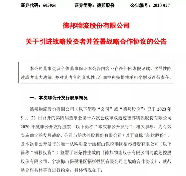 5月24日晚間披露非公開發(fā)行預案,擬募集資金總額不超過6.14億元,用于轉(zhuǎn)運中心智能設備升級項目和IT信息化系統(tǒng)建設項目。本次非公開發(fā)行的發(fā)行價格為9.20元/股,發(fā)行對象為福杉投資。本次非公開發(fā)行完成后,福杉投資預計持有公司總股本比例約為6.5%,福杉投資依托于韻達股份的相關戰(zhàn)略資源,與德邦股份具體開展戰(zhàn)略合作。