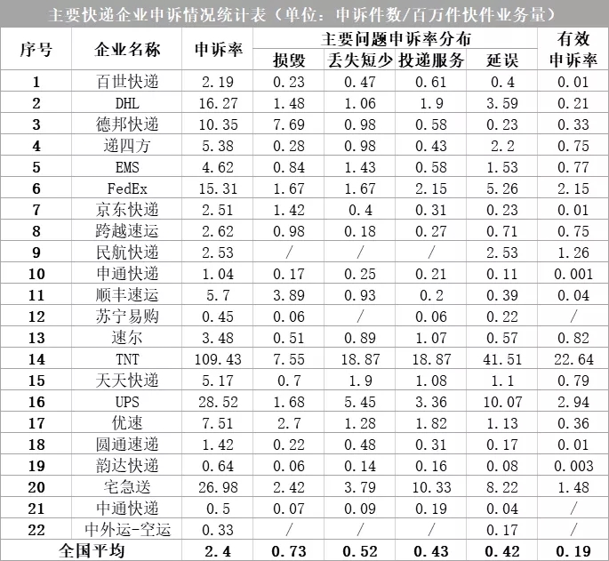 全國快遞企業(yè)申訴率(百萬件快件業(yè)務(wù)量)平均為2.40,有效申訴率平均為0.19。用戶對(duì)快遞企業(yè)申訴主要問題中,快件損毀申訴率平均為0.73,快件丟失短少申訴率平均為0.52,投遞服務(wù)申訴率平均為0.43,快件延誤申訴率平均為0.42。
