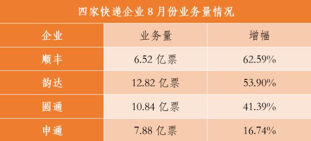 9月18日晚間,順豐控股、圓通速遞、韻達(dá)股份和申通快遞四家企業(yè)發(fā)布8月經(jīng)營簡報(bào)。數(shù)據(jù)顯示,四家快遞企業(yè)繼續(xù)保持高速增長。其中,順豐業(yè)務(wù)量增幅繼續(xù)領(lǐng)跑,韻達(dá)連續(xù)五個月、圓通連續(xù)四個月單月業(yè)務(wù)量破10億票。