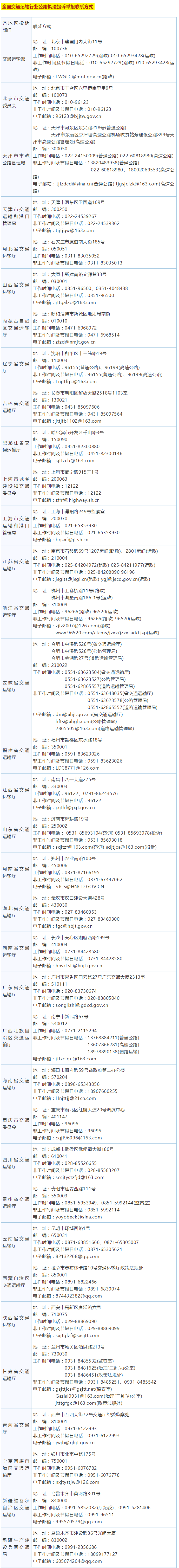 交通運(yùn)輸部公路局、道路運(yùn)輸司聯(lián)合向社會集中公布全國交通運(yùn)輸行業(yè)公路執(zhí)法行風(fēng)投訴舉報(bào)電話、通信地址和電子郵箱地址。