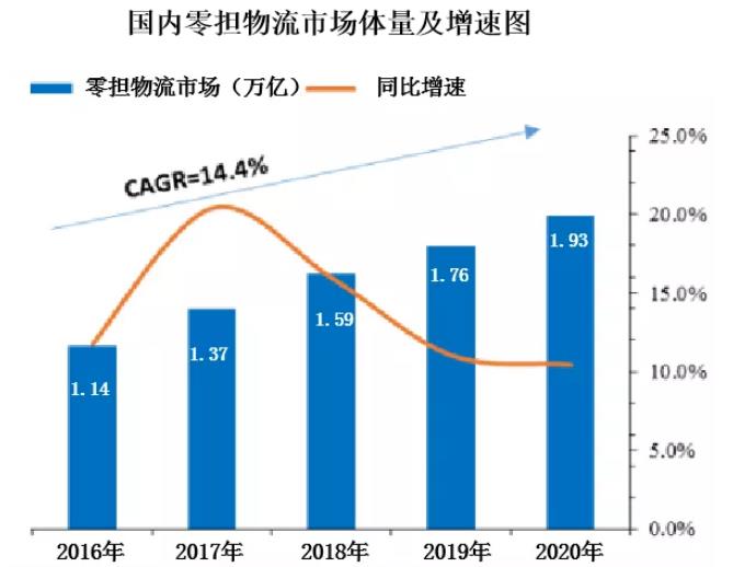 專家預(yù)測(cè),到2020年,零擔(dān)物流(即專線物流)行業(yè)市場(chǎng)體量將達(dá)到近2萬(wàn)億元。從2016年開始,整個(gè)市場(chǎng)都在以10%以上的速度在增長(zhǎng),發(fā)展前景十分廣闊。