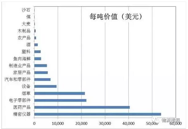 其次是經(jīng)濟水平?jīng)Q定的貨物價值。同樣一公斤貨,因為單公斤貨物價值的不同會對GDP產生很大影響。例如下圖是美國不同類別的貨物平均每噸的價值,可以看到差別非常大,一噸煤和一噸煙草價值可以相差100倍。同樣一噸貨物,價值更高對應的GDP就更高。