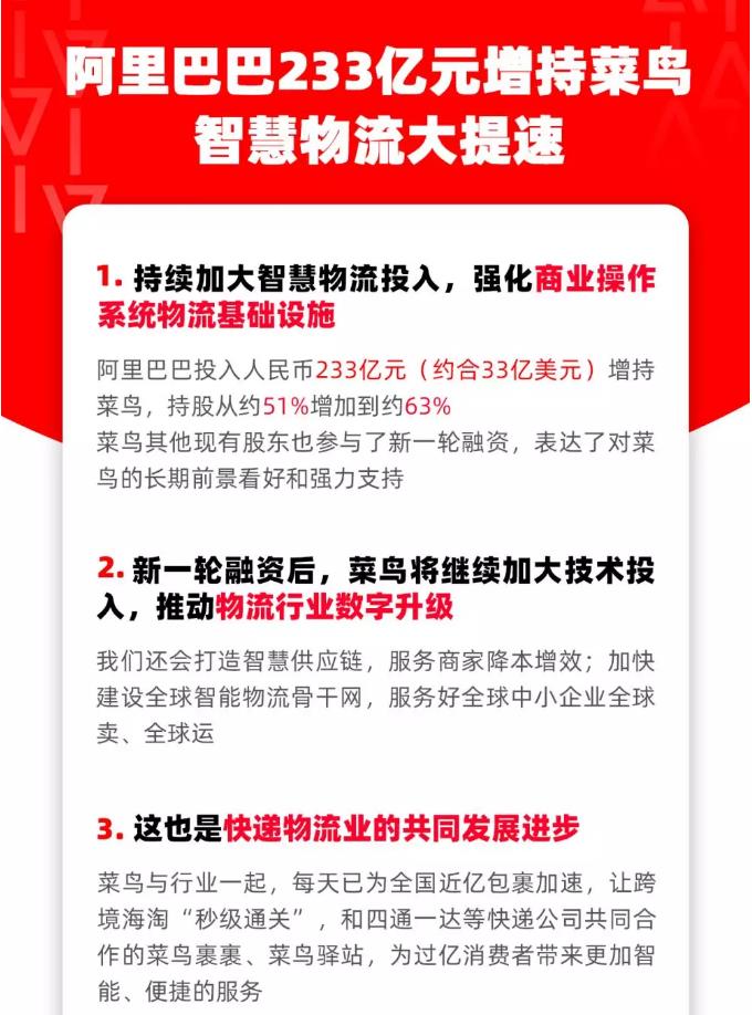 阿里巴巴集團(tuán)11月8日宣布,為持續(xù)加大智慧物流投入,強(qiáng)化商業(yè)操作系統(tǒng)物流基礎(chǔ)設(shè)施,已領(lǐng)銜完成對(duì)菜鳥網(wǎng)絡(luò)新一輪增資。阿里巴巴通過增資和購買老股的方式,投入人民幣233億元(約合33億美元),持有菜鳥股權(quán)從約51%增加到約63%。菜鳥其他現(xiàn)有股東也參與了新一輪融資,表達(dá)了對(duì)菜鳥的長(zhǎng)期前景看好和強(qiáng)力支持。